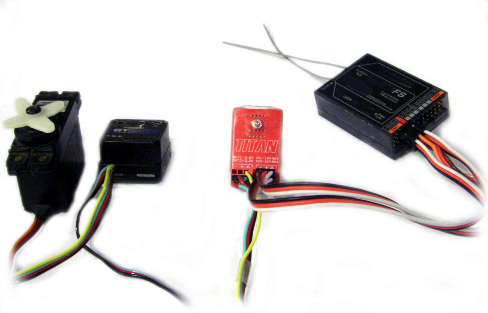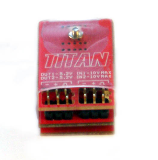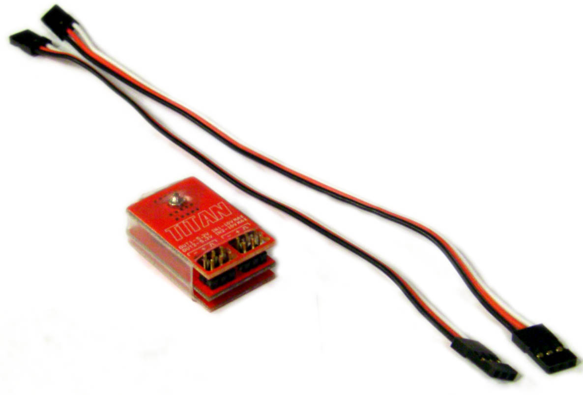 The Titan Dual Step Down Voltage Regulator provides regulated voltage protection for up to two servo functions with two input ports and two output ports. The Titan eliminates the danger of higher voltage power systems to standard voltage servos by being placed in between the receiver and the servo requiring a 5.2 volts regulation. Dual Step Down Regulator is primarily designed for use with gyros in helicopters. Most brands of gyros/ tail rotor servos have voltage limits of 6 volts or less. The Titan installs between the receiver and the gyro in the rudder and gain channels and regulates the voltage to the gyro and tail rotor servo to 5.2 volts. This allows the rest of the system to operate using higher voltage of typical 7.4V up to 10V, providing increased servo performance and response. The Titan is ideal for any R/C models that are equipped with servos with limited input voltage range.