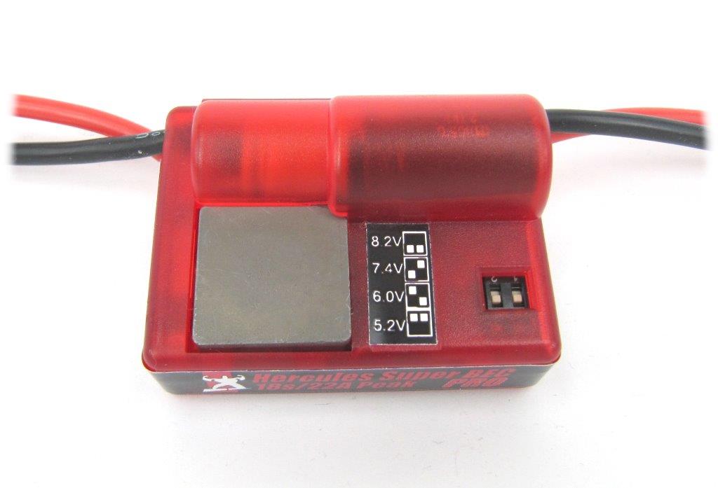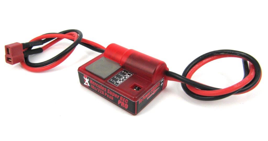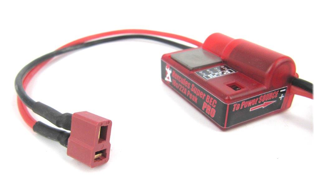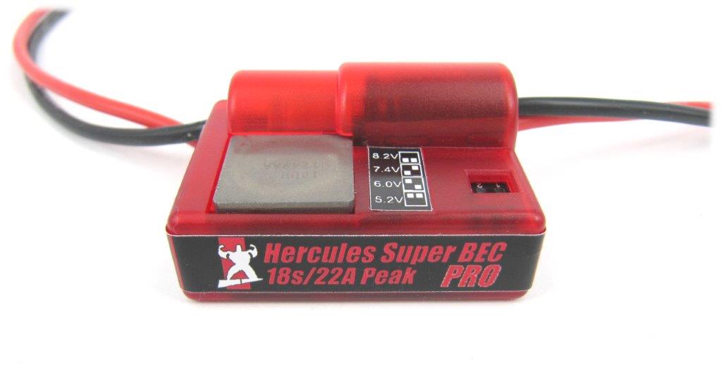 This new Hercules Battery Eliminator Circuit Pro Mini is capable of handling extreme high voltages and is made with high quality components that can withstand outstanding high current loads of 16 Amps continuous / 22 Amps peak. The Hercules Super Battery Eliminator Circuit PRO Mini is a glitch free high efficiency, high power switching voltage regulator designed to work with all popular brands of R/C receivers and servos. It provides safe and consistent power to your R/C receiver and servo(s) that eliminates the need for a separate battery source. The Hercules Super will boost performance on your R/C model by reducing the overall weight while maintaining a high current output from high voltage sources up to a 18s LiPo battery (75.6V). The Hercules Super BEC PRO Mini has high current rated silicone output wires with a Deans type connector. This will eliminate any unnecessary voltage drops that can occur with standard servo output cables. Technically it is not possible to deliver more than 10 amps through one or two servo type connectors, therefore a single pair of high power silicone wires and connector provides flexibility for user custom wiring that can provide real current delivery.